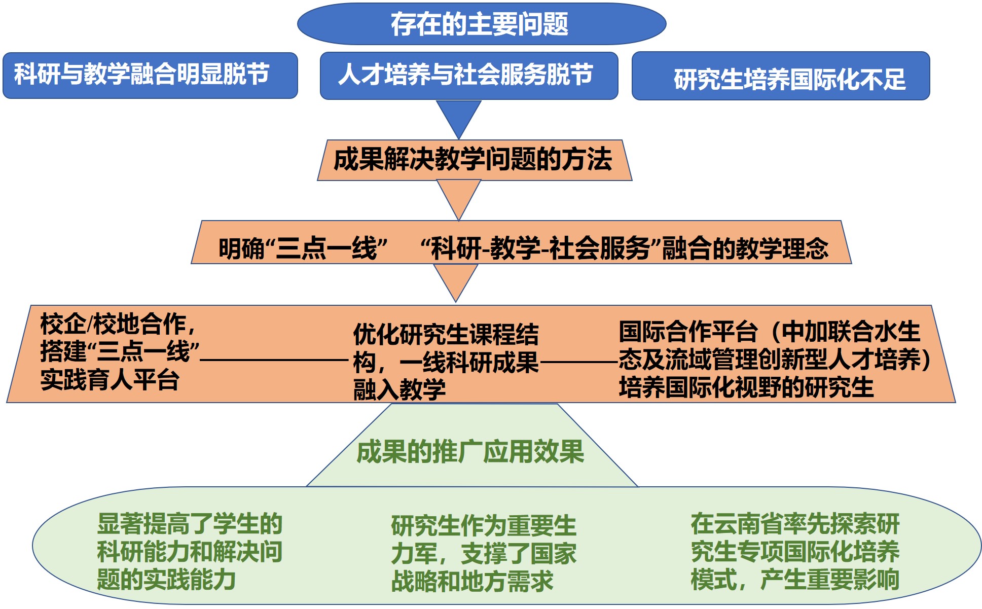 本体系的核心是“三点一线、深度融合”,即将科研-教学-社会服务三个节点连通成线,在培养研究生过程中协同增效,共同服务于高层次人才培养的总目标。代表性案例包括:1)面向构建西南生态安全和生物多样性宝库的国家战略,将科研成果有机融入研究生《生物多样性保护》《恢复生态学》等课程教学,引导研究生在完成“极小濒危物种大树杜鹃保护”、“杞麓湖水生态重构”等项目过程中提升科研技能;2)聚焦云南省高原特色现代农业的共性关键技术,校企联合建设“云南省微生物菌剂工程研究中心”“云南省作物病虫害生物防控工程技术研究中心”,引导研究生积极开发绿色农业产品,申请专利10件,其中廖菊够博士开发的烟草单克隆抗体库和抗体芯片获得博士后创新创业大赛全国优胜奖;3)面向云南文化旅游产业升级的重大需求,利用《科学哲学与科学研究方法》《生态旅游》等课程培养研究生的科普素养,设计生态研学产品、生态旅游产品,积极服务COP15等国家重大活动,利用省级科普教育基地平台培养一批可服务于生态旅游、科普旅游的复合型人才;4)面向高原湖泊水生态和污染治理等国家重大需求,校企合作成立“高原湖泊治理与研究中心”,联合加拿大温莎大学,在云南省率先申报并获准留基委立项“中加联合水生态及流域管理创新型人才培养”项目,培养具有国际视野的博士研究生。近年来云大生态学的研究生以第一/并列第一作者身份发表Nature、Nature Communication等高水平论文45篇,获得国家奖学金15人次,专利15件,参与开发的产品3件,在研究生创新大赛中获奖4项。其中,解玮佳获云南省科技进步奖特等奖、吴程获五一劳动奖章,毕业研究生在各自岗位上建功立业,成果突出。