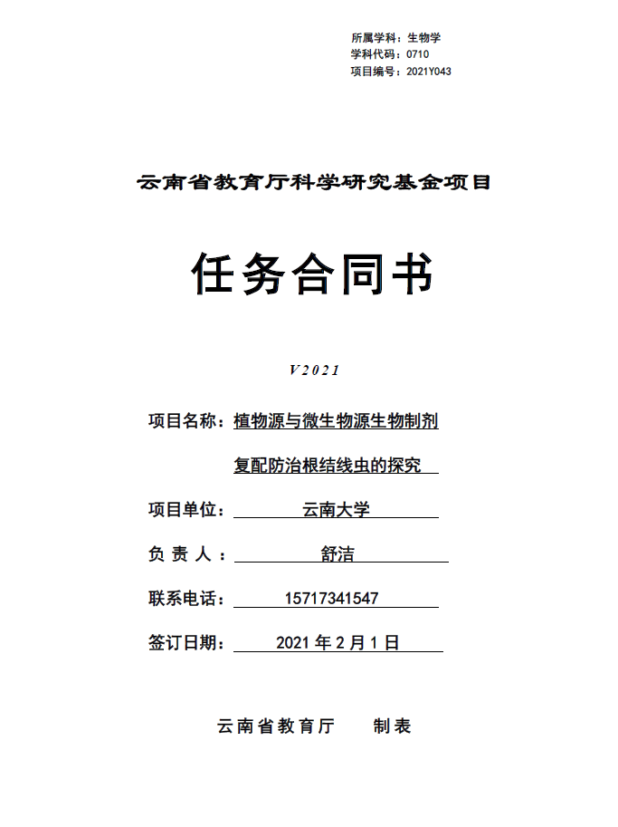 h) 舒洁,植物源与微生物源生物制剂复配防治根结线虫的探究.云南省教育厅科学研究基金项目.2021