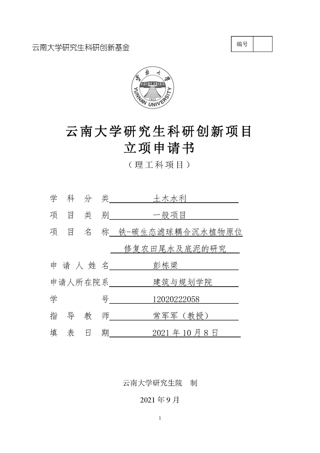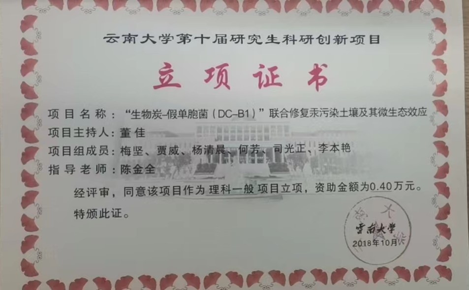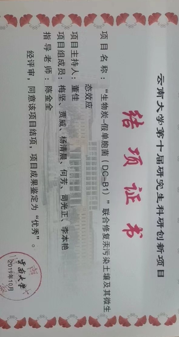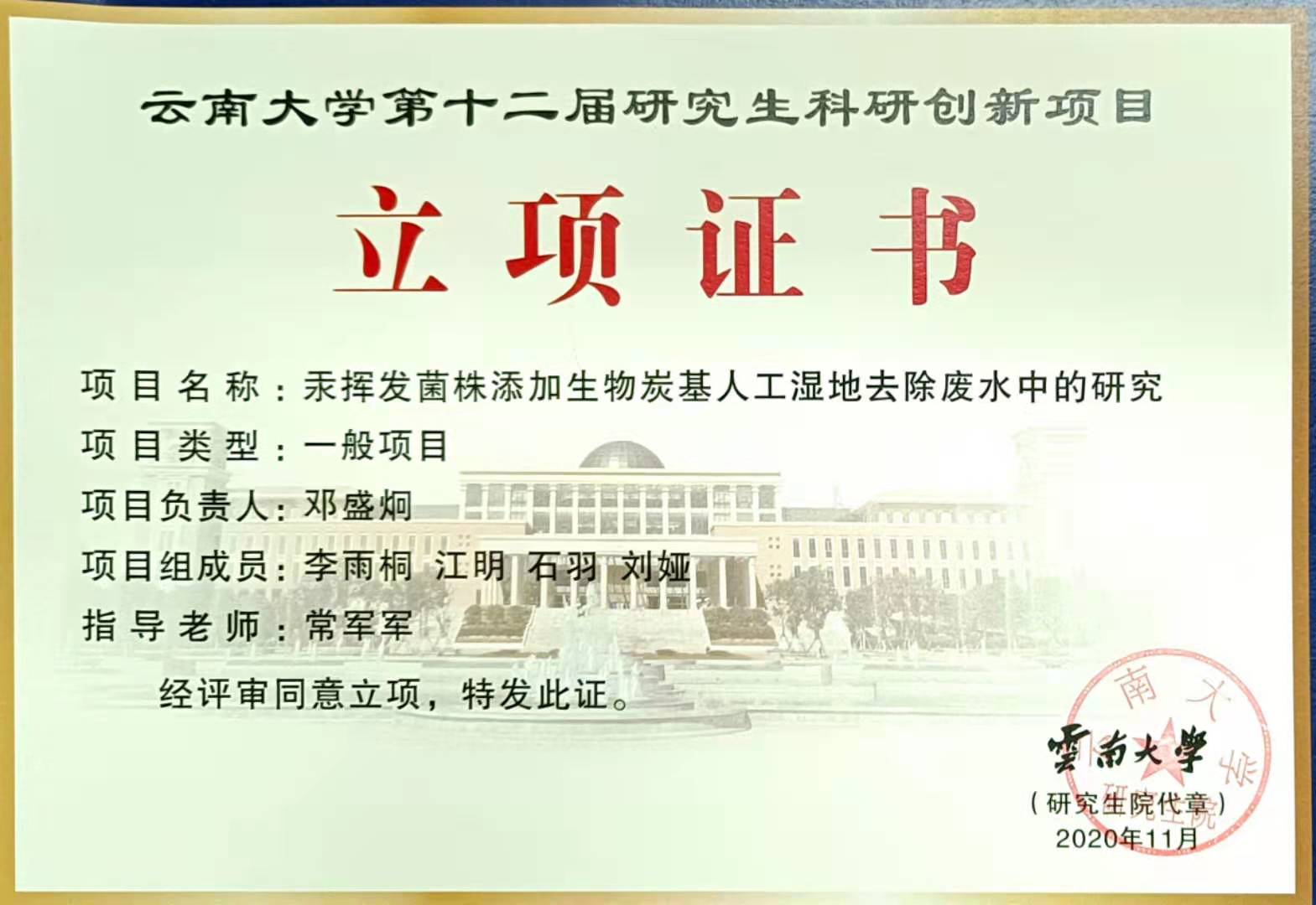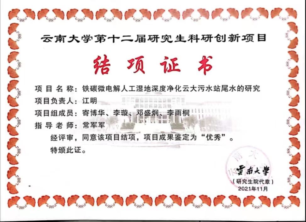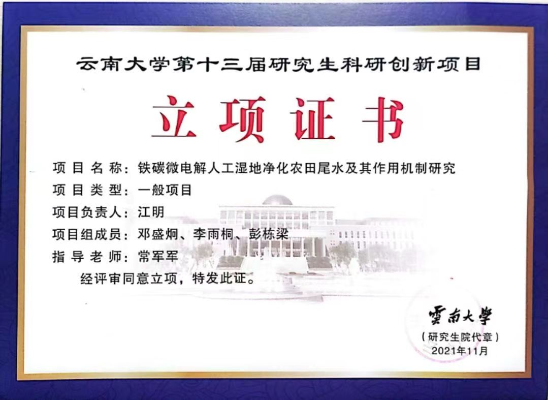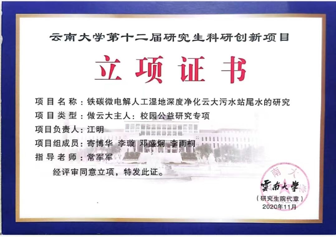 b) 江明. 铁碳微电解人工湿地深度净化云大污水站尾水的研究.研究生科研创新项目.2020