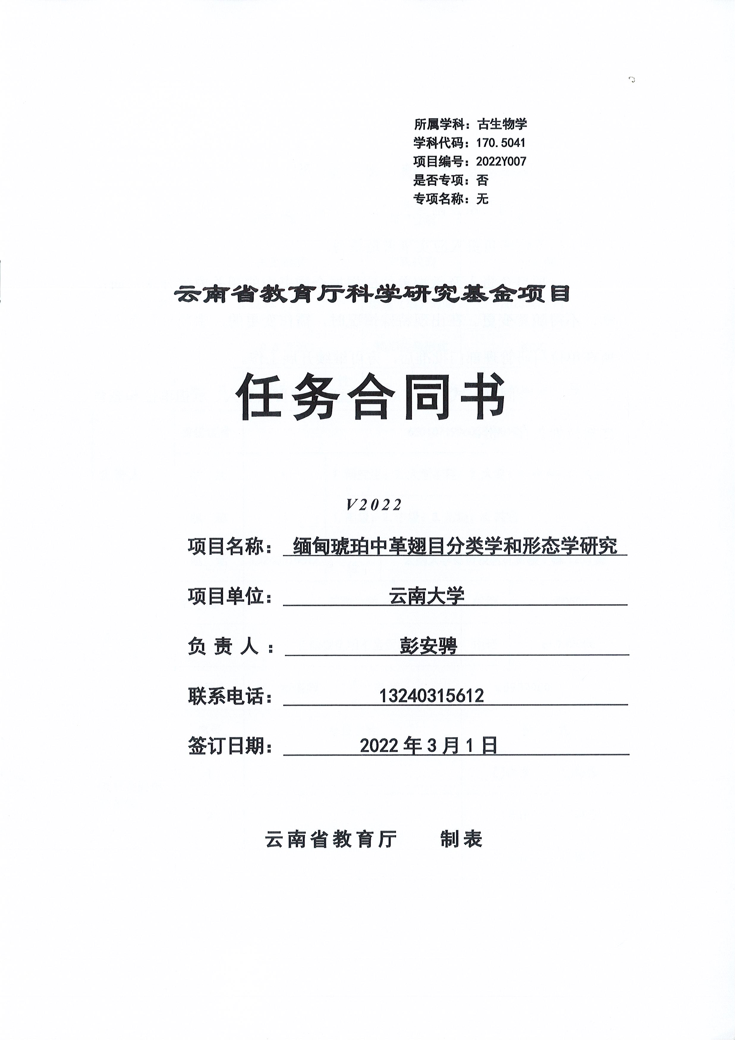 k) 彭安骋,缅甸琥珀中革翅目分类学和形态学研究,云南省教育厅科学基金项目,2022Y007,2022.03.01-2023.02.28,0.5万元