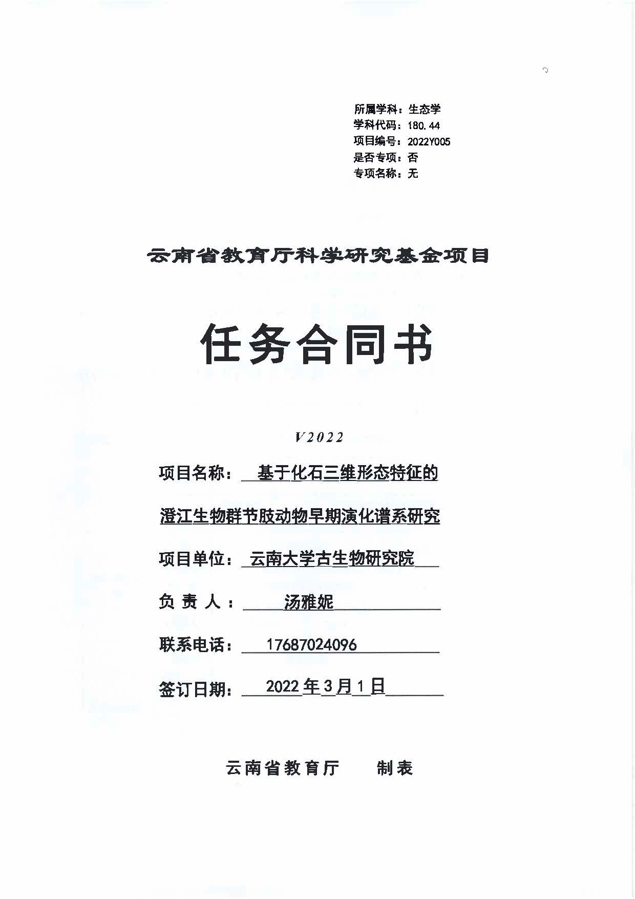j) 汤雅妮,基于化石三维形态特征的澄江生物群节肢动物早期演化谱系研究,云南省教育厅科学基金项目,2022Y005,2022.03.01-2023.02.28,0.5万元