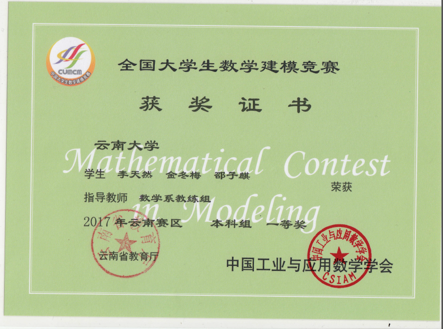 赵越老师带学生荣获全国大学生数学建模竞赛一等奖