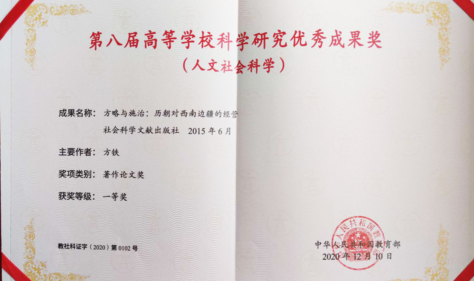 第八届中国高校人文社会科学研究优秀成果奖-方铁一等奖